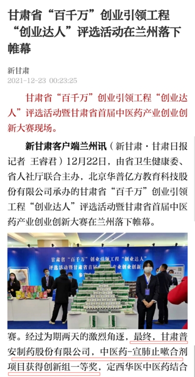 多家媒體爭相報道,“甘肅普安制藥股份有限公司榮獲甘肅省首屆中醫藥產業創業創新大賽創新組第一”強勢霸屏