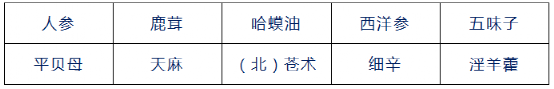 剌五加、五味子、人參、西洋參、漢麻(火麻仁)、關(guān)防風、赤芍、板藍根、鹿茸
