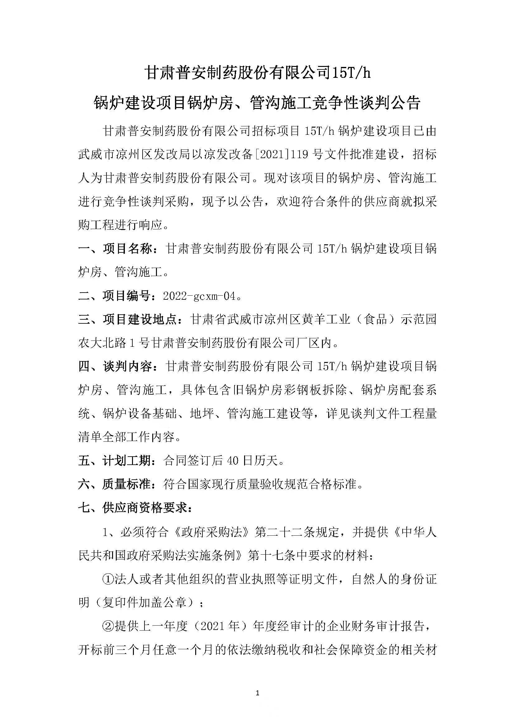 甘肅普安制藥股份有限公司15T/h鍋爐建設(shè)項目鍋爐房、管溝施工競爭性談判公告
