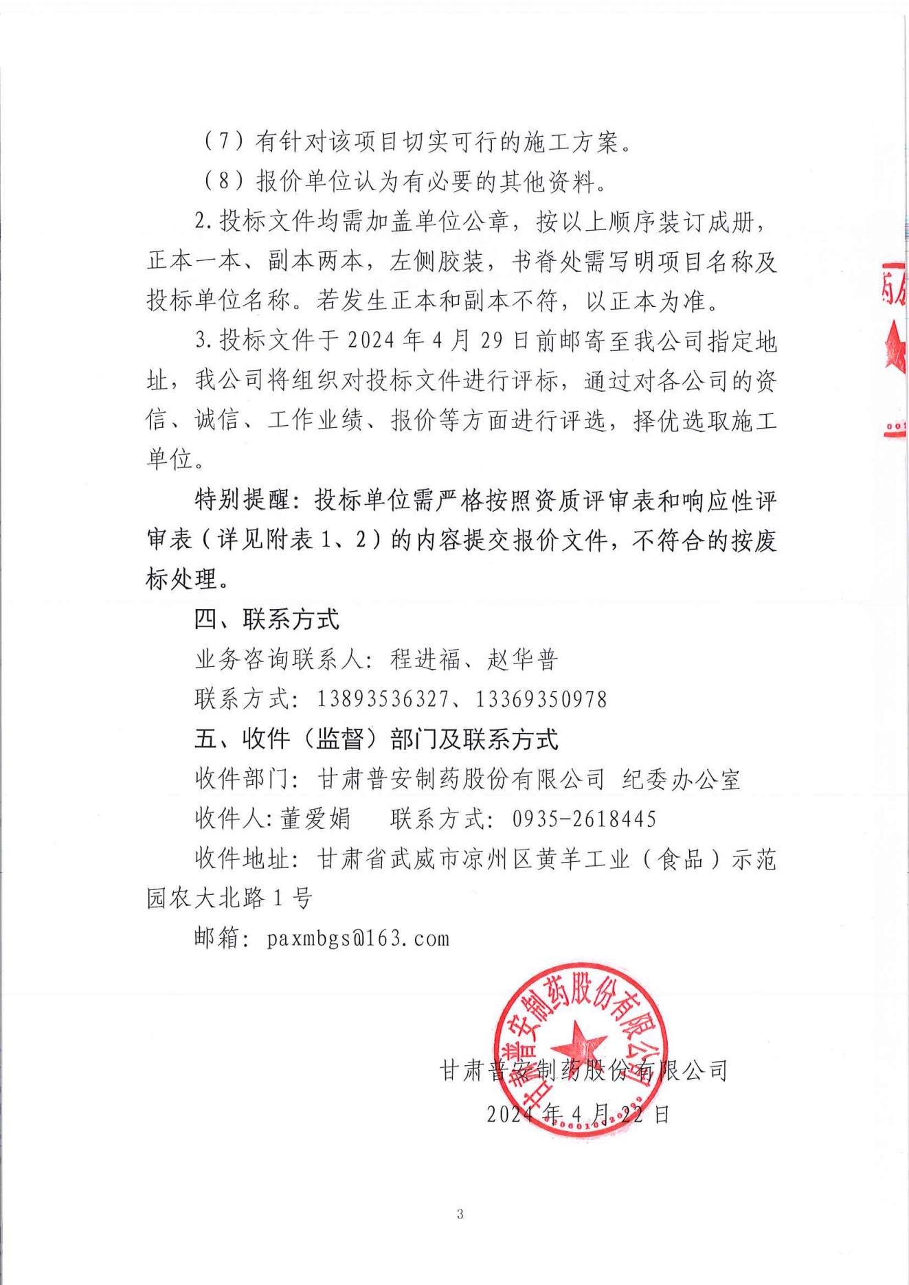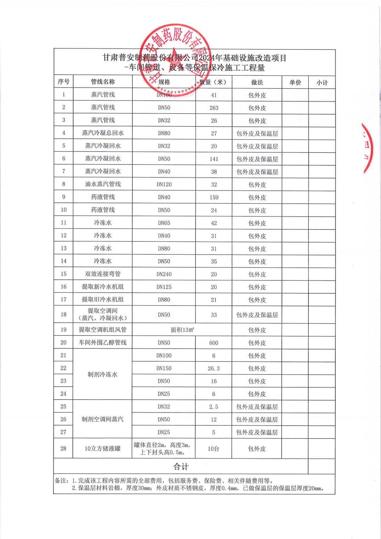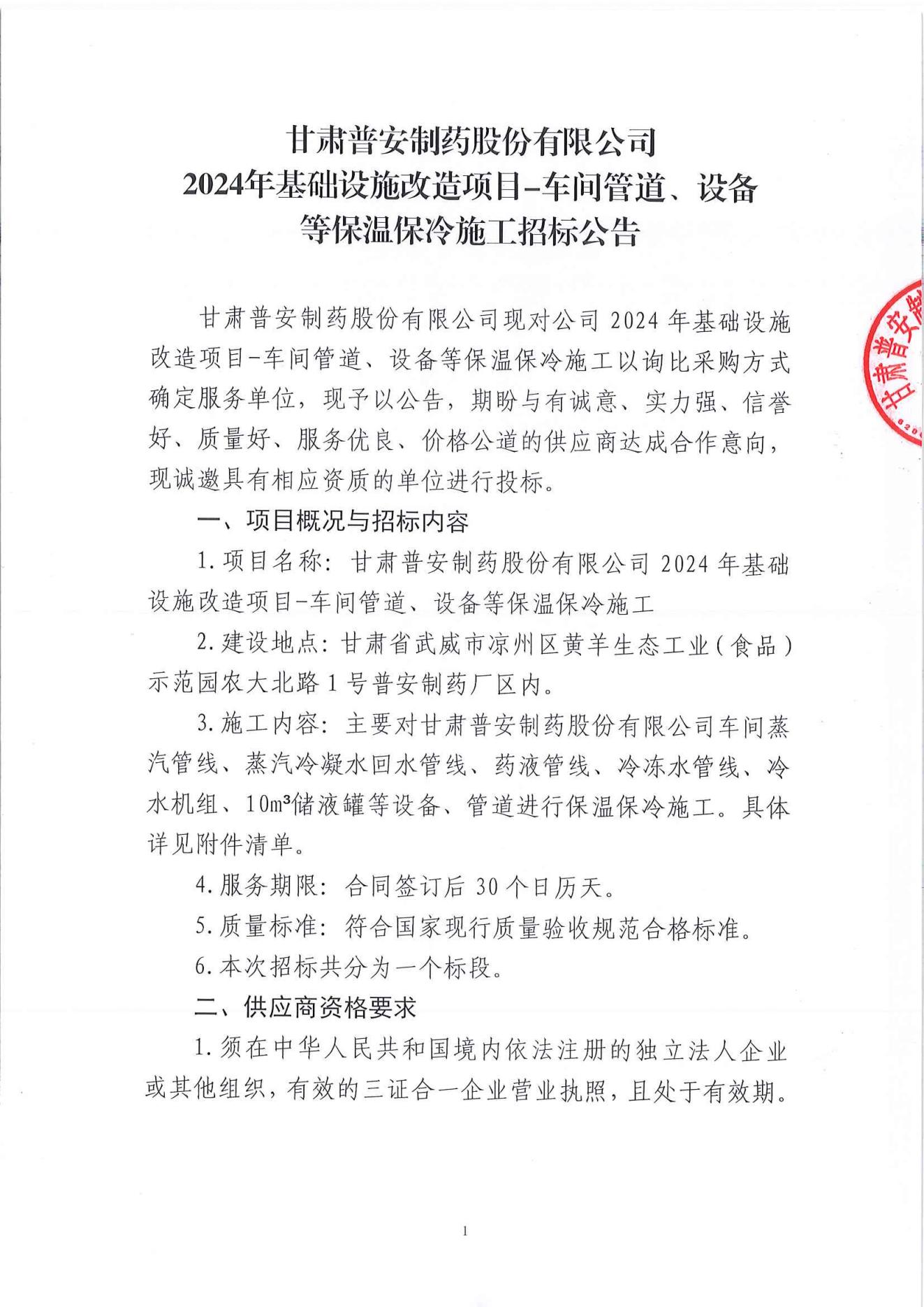 甘肅普安制藥股份有限公司2024年基礎(chǔ)設(shè)施改造項目-車間管道、設(shè)備等保溫保冷施工招標公告