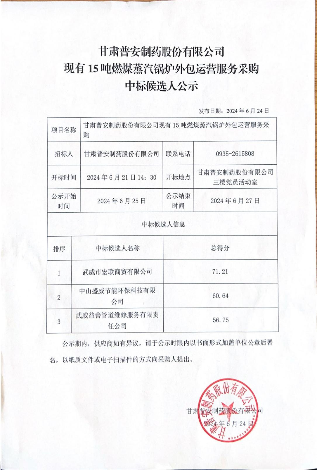 甘肅普安制藥股份有限公司現(xiàn)有15噸燃煤蒸汽鍋爐外包運(yùn)營服務(wù)采購中標(biāo)候選人公示