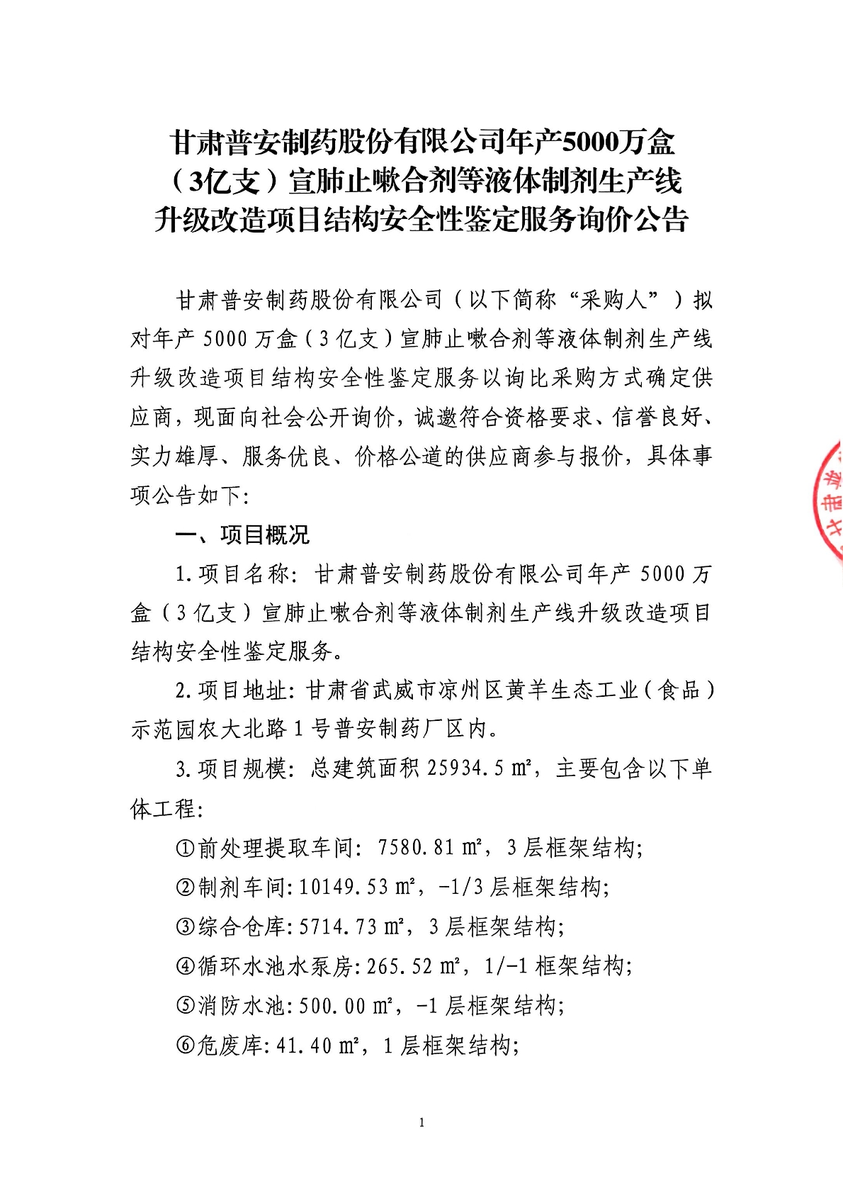 甘肅普安制藥股份有限公司年產5000萬盒(3億支)宣肺止嗽合劑等液體制劑生產線升級改造項目結構安全性鑒定服務詢價公告